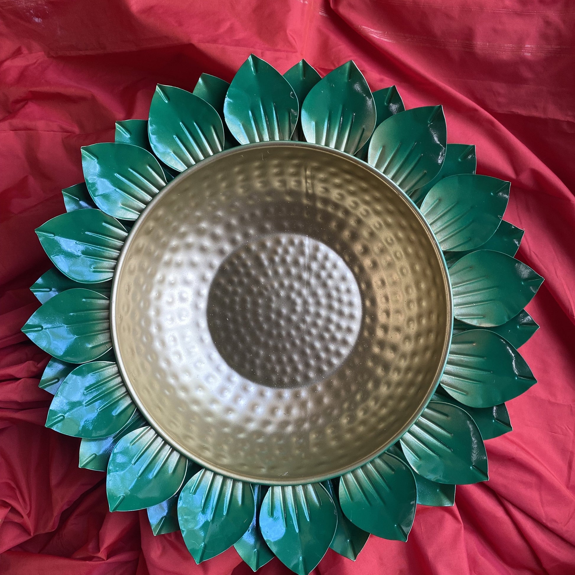 Lustre Lotus Urli Bowl – Hammered Gold Finish With Green Petals (Medium)
